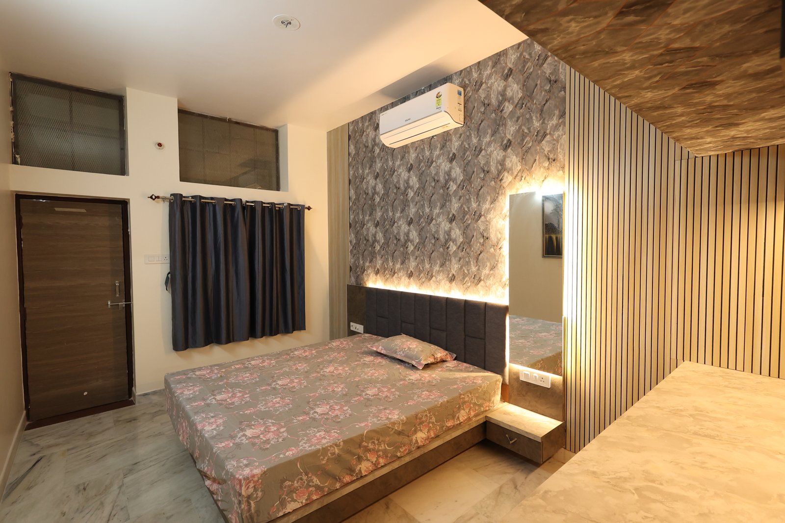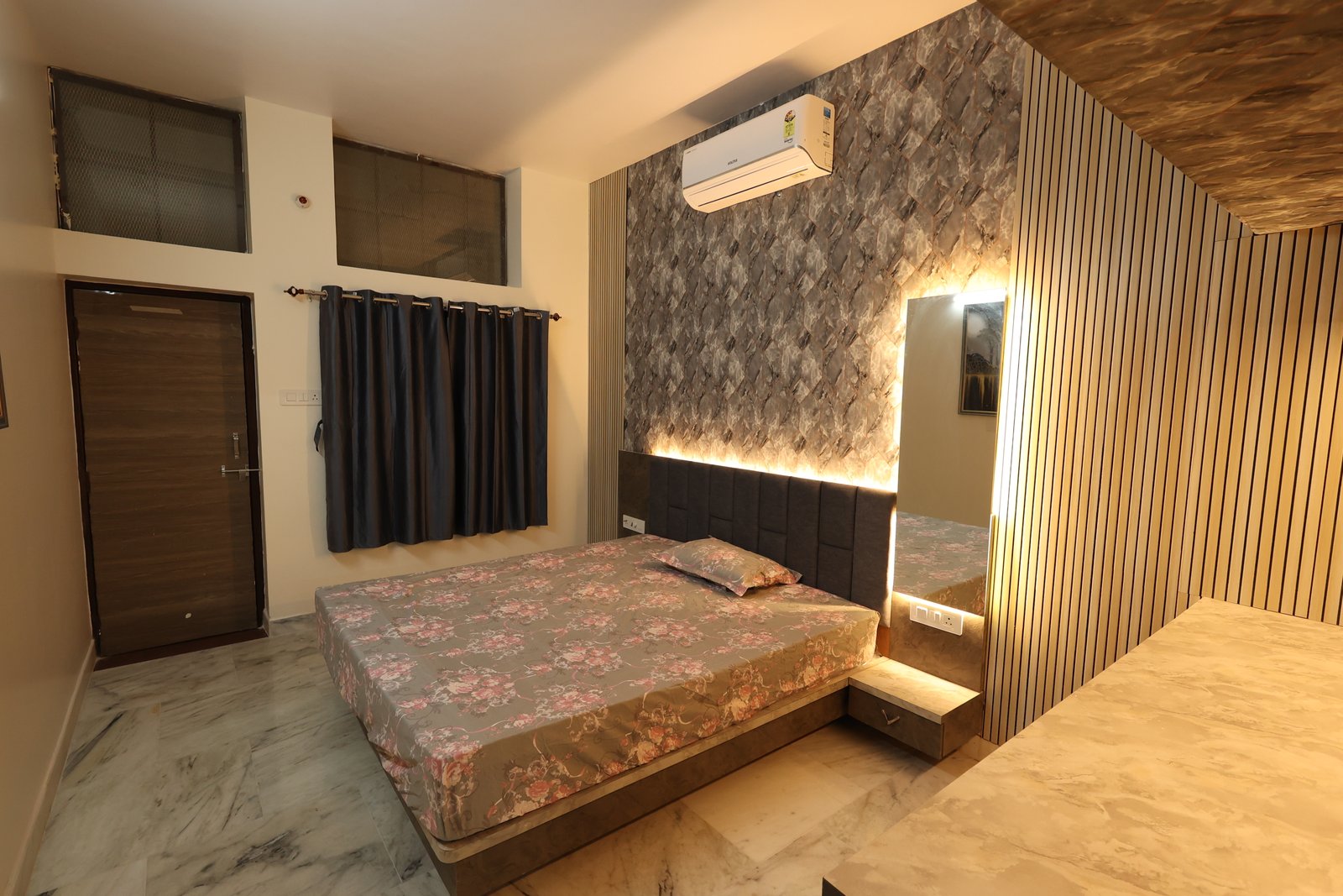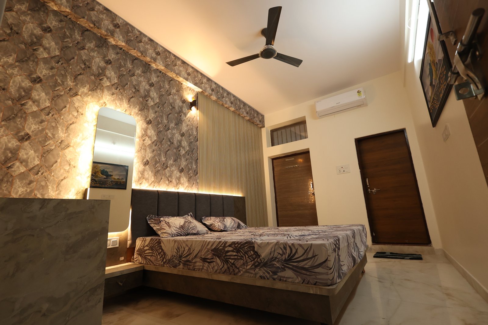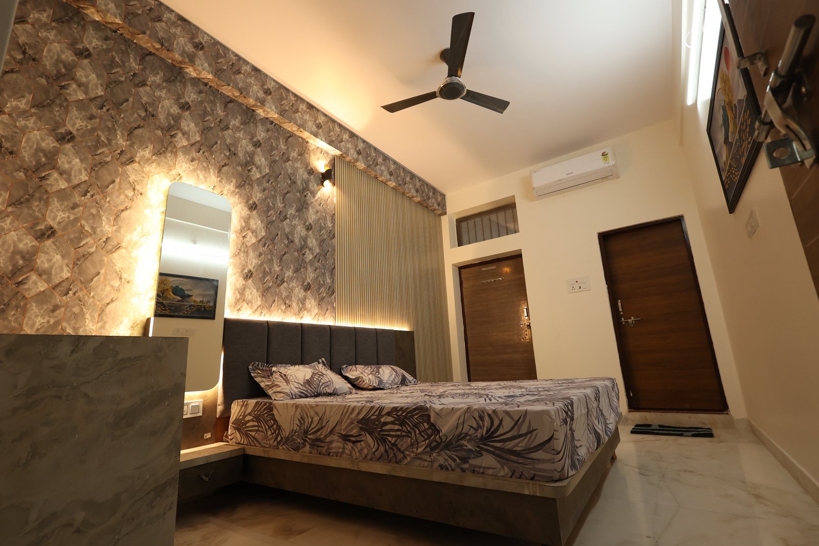 Book NowThis luxurious modern retreat in Jodhpur blends sleek style with cozy comfort. The chic living area with wooden accents and marble floors is great for relaxing or entertaining. A stylish bedroom with geometric flair offers family comfort. Perfect for reunions or parties, it features a rooftop terrace with Blue City views, Wi-Fi, local tours, and all the essentialsโideal for exploring Jodhpur and creating lasting memories.